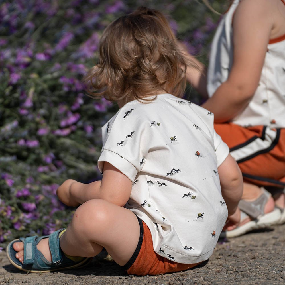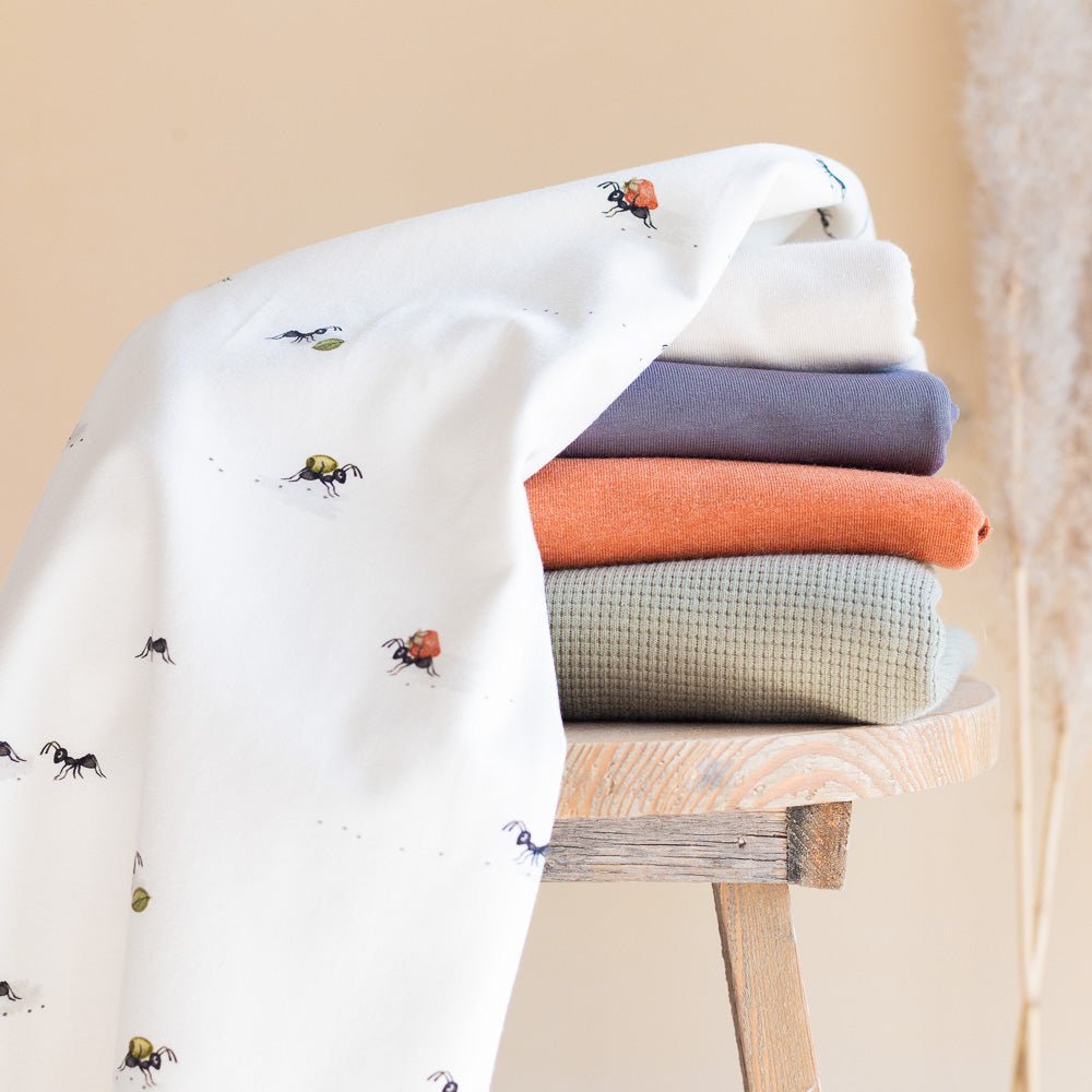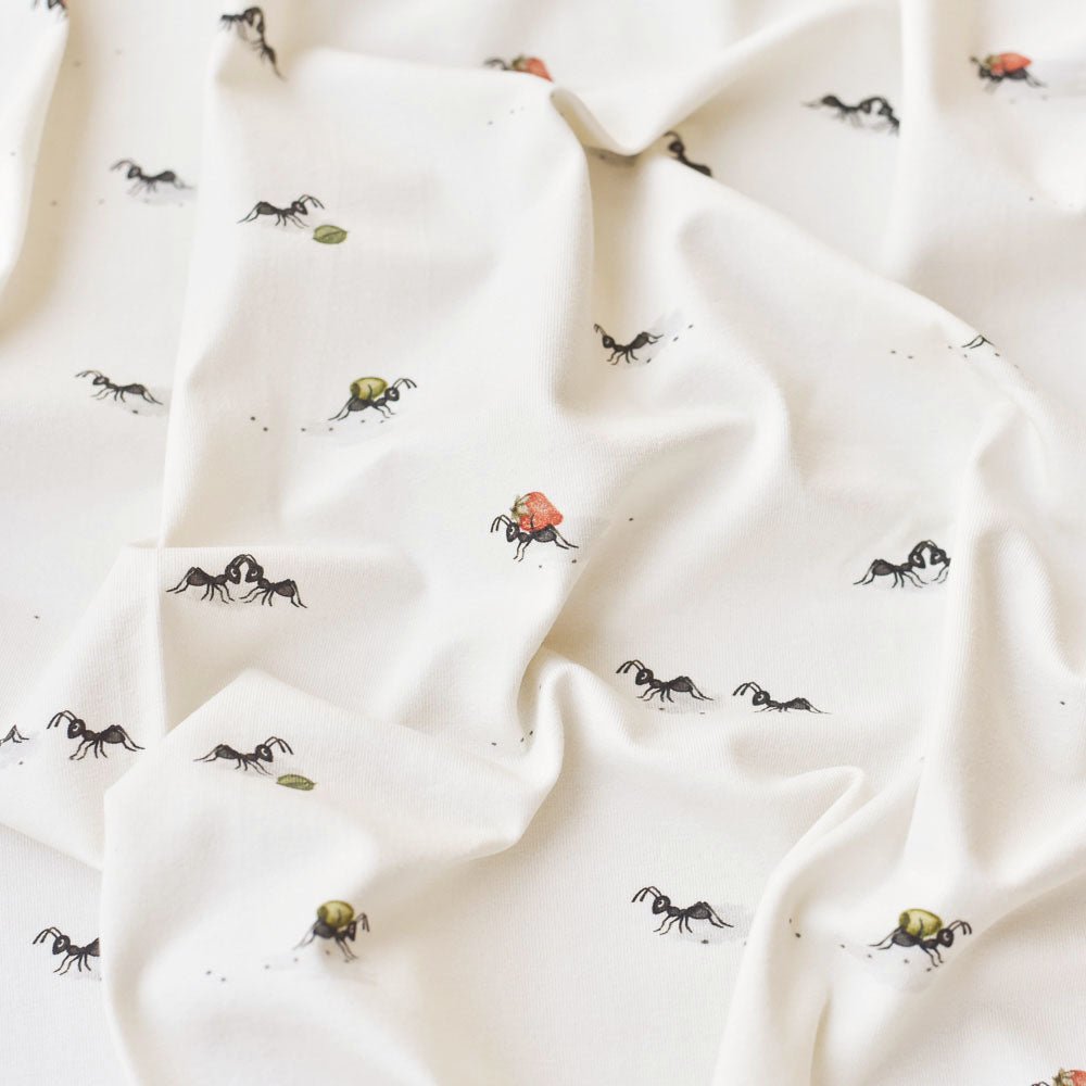 Früchtetransport – die fleißigen Ameisen auf außergewöhnlich weichem Jersey oder French Terry.