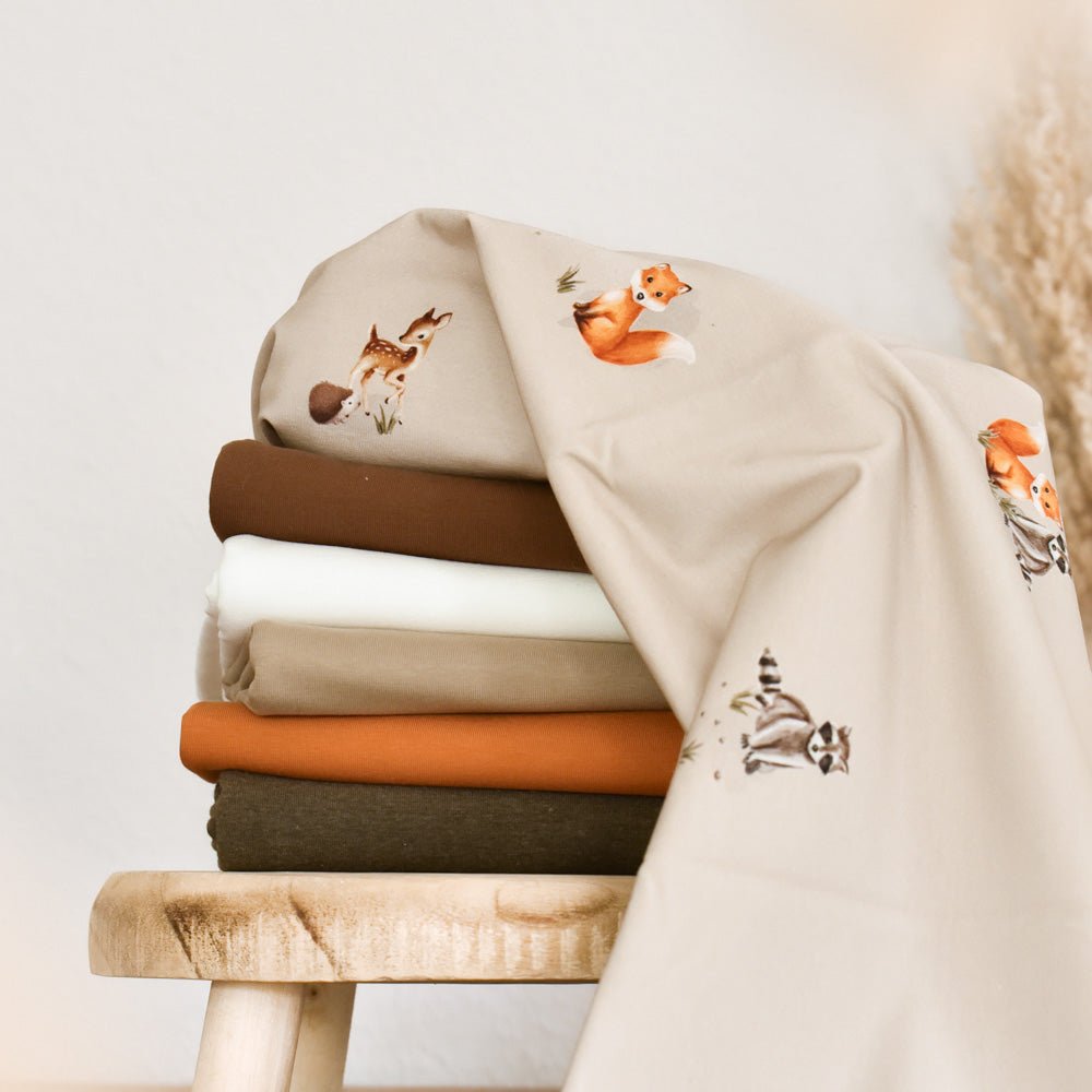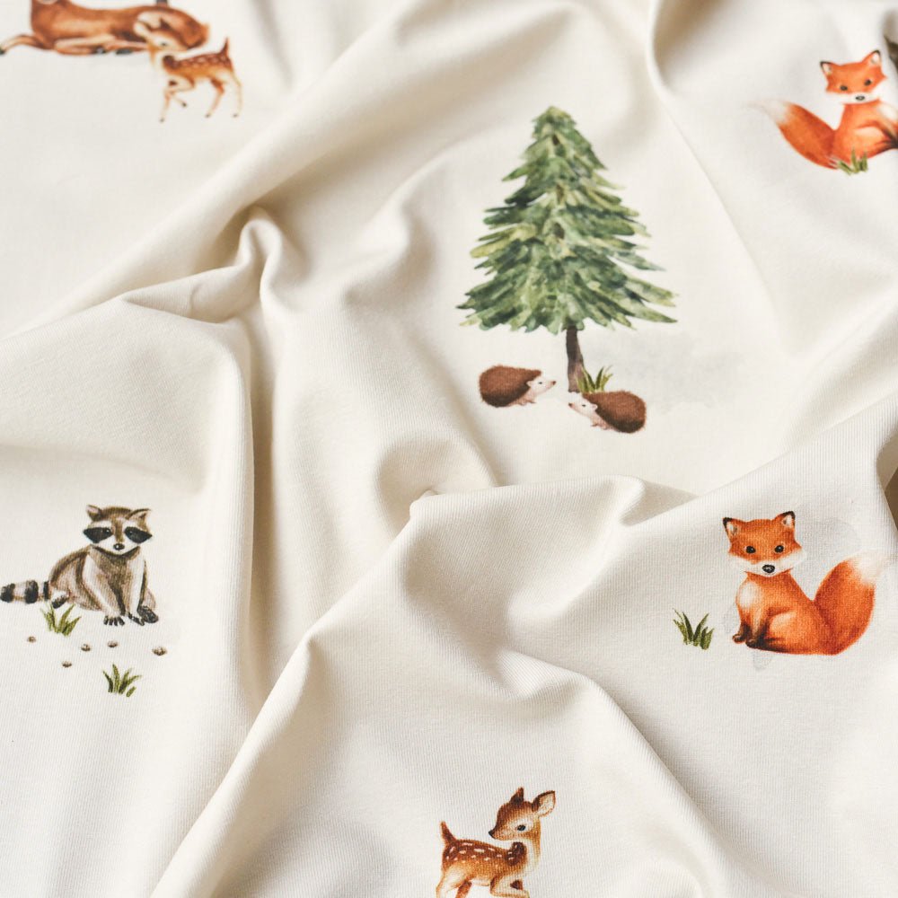 Tief im Wald – mit Fuchs, Waschbär, Igel und Reh/Hirsch auf außergewöhnlich weichem Jersey oder French Terry.