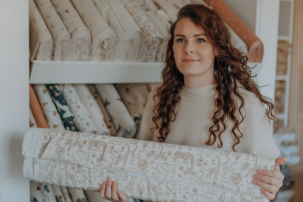 - 90 % unserer Stoffdesigns male ich – Lena, Gründerin von Krümelchen & Kuchen – selbst.